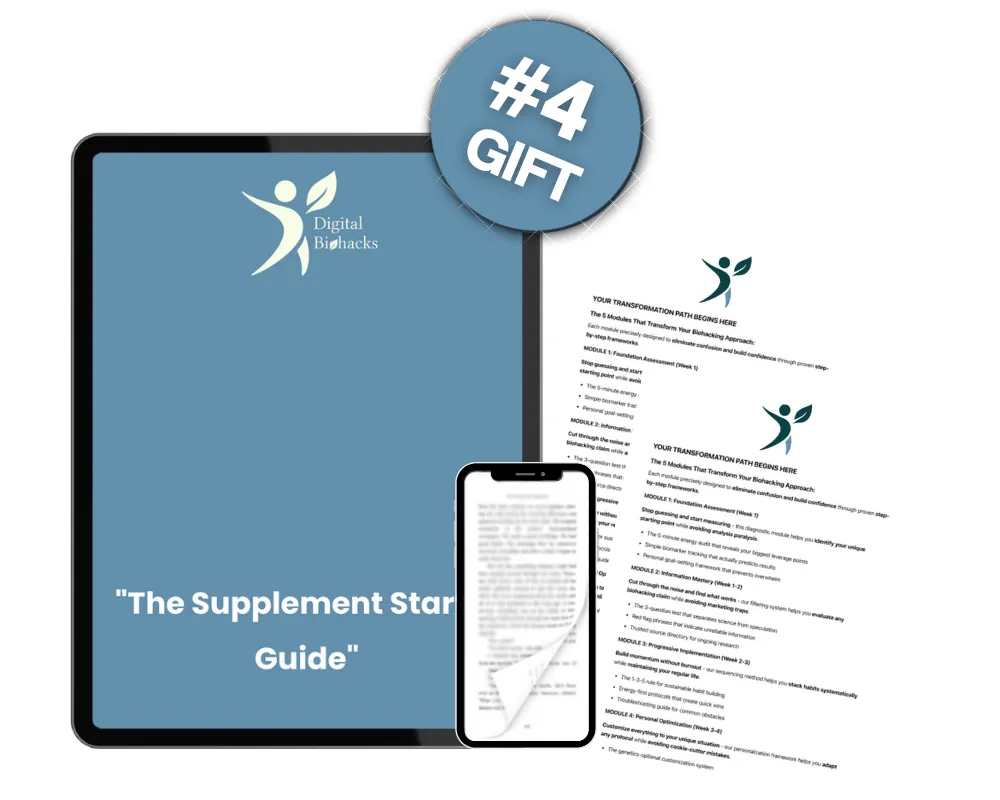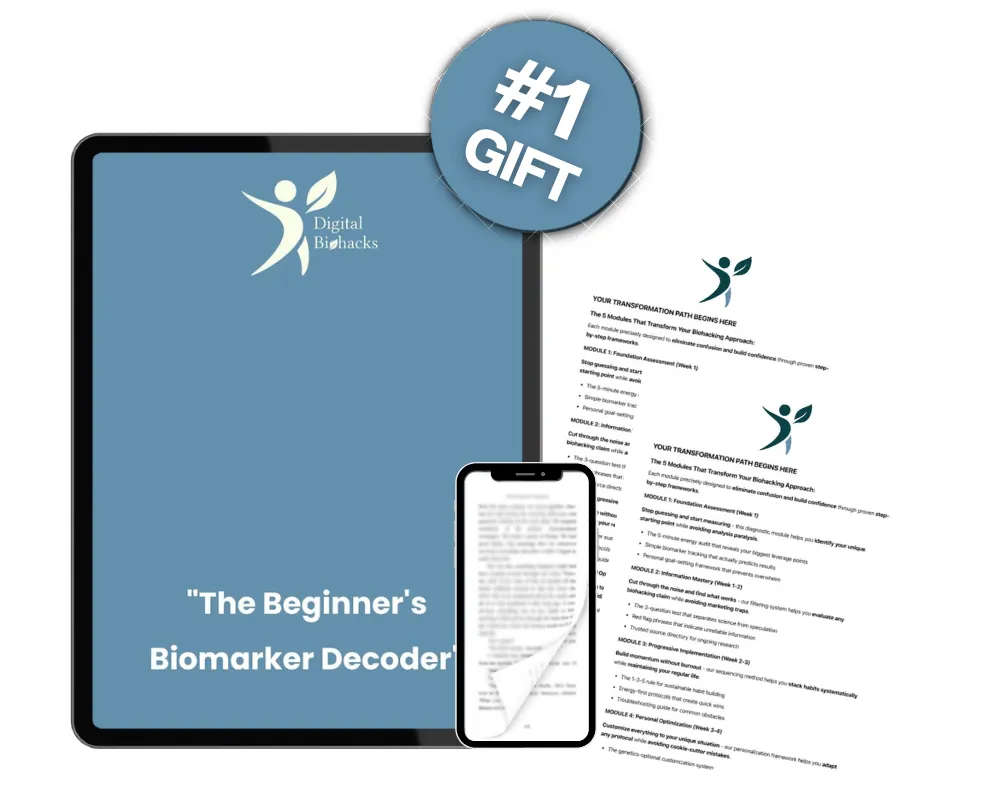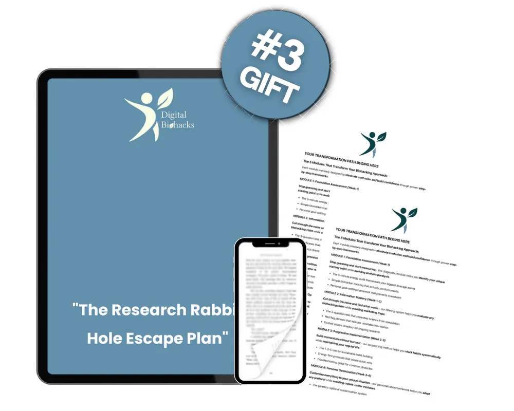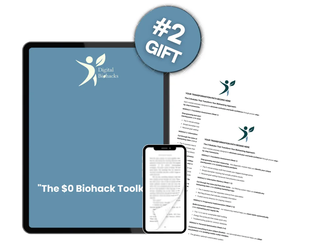 Yes! Along with the main program, you’ll receive 5 practical bonuses: a beginner’s biomarker decoder, a $0 biohack toolkit, the research rabbit hole escape plan, a supplement starter guide, and a 30-day quick-start checklist
