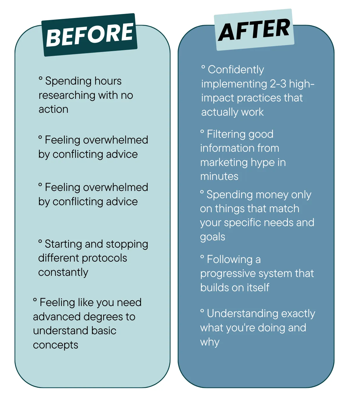 Because our approach focuses on filtering real science from marketing hype. We don’t add more noise—we give you a proven framework to identify what works and adapt it to your life. Over 200 people have already applied it successfully